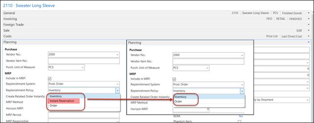 The functionality regarding Replenishment Policy Instant Reservation of the Master/Item has been deleted. Therefore, the only options left are Inventory or Order.