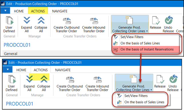 In addition, the Action in the Production Collecting Order for Generate Prod. Collection Order Lines has been changed; the option On the Basis of Instant Reservations has been deleted.